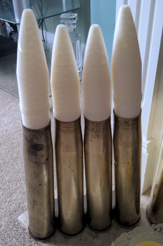 I started out with replica 40mm Bofors shells. I had plenty of 40mm cases and had managed to acquire a couple of the original inert training projectiles, but had a full clip of 40mm cartridges on my hearth that needed projectiles for them. First step was to ‘slice’ the STL file I had acquired, to turn it into a file my printer could understand. That done, I set about printing 4 of them.
