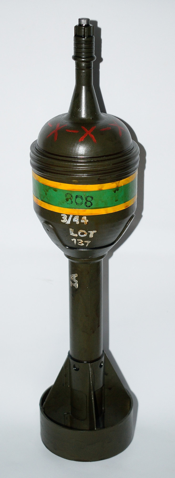 British 2 inch mortar bomb. Safety cap has standard ‘Remove Before Firing’ wording & arrow. and can be removed. Body of the bomb has shellac colour and two colour bands. Stencilling as shown in picture. Hand painted so there will be slight variations in the finish.