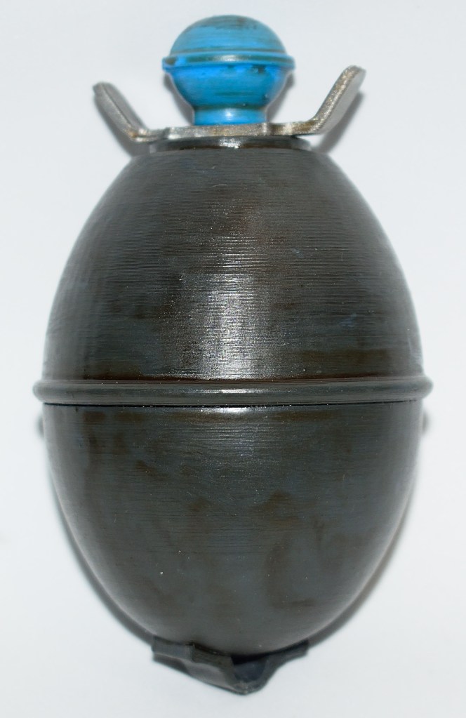 German Model 39 egg hand grenade. Available with all four fuze colours, and either aged or ‘factory fresh’. Comes with eyelet for split ring on the base of the grenade. Hand painted so there will be slight variations in the finish, with different fuze colours available.