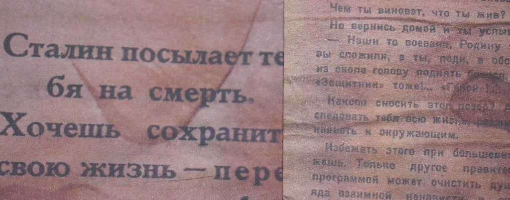 German propaganda rifle grenade. Comes with stencil as shown as well as printed copies of TWO ORIGINAL propaganda leaflets from the eastern front, (cropped example shown). Cap is removeable, with both leaflets inside the grenade. Hand painted so there will be slight variations in the finish.