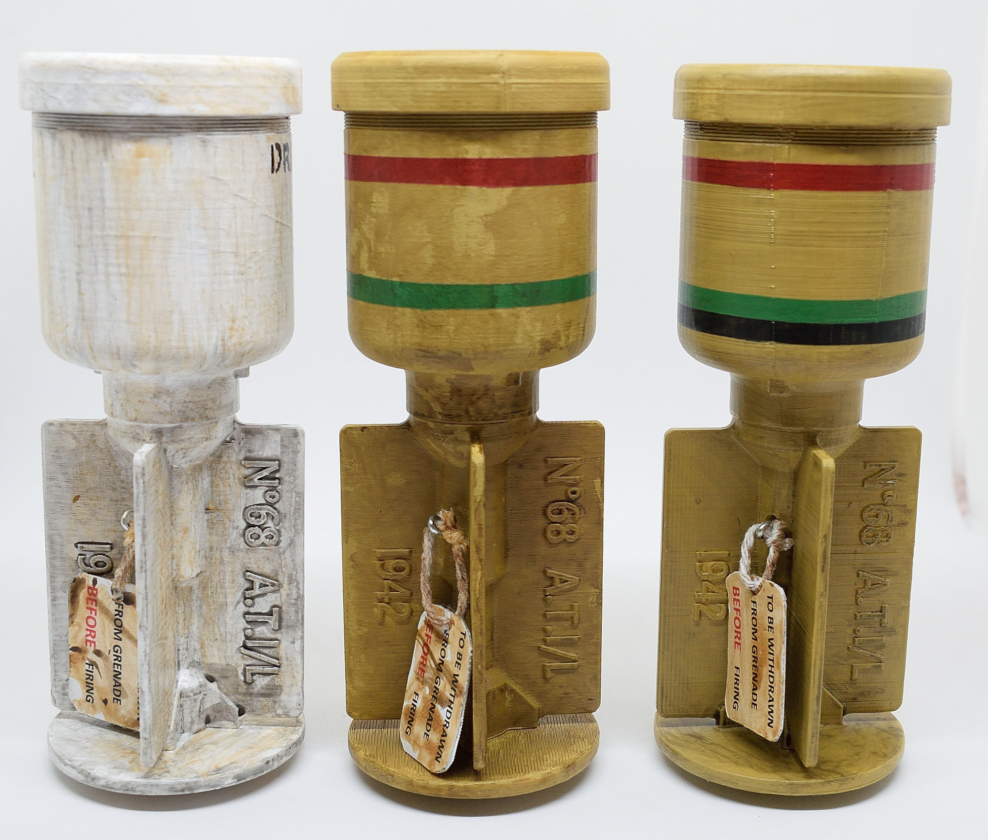 No. 68 shaped charge grenade. Comes as a solid model, with the only removeable part being the pin and safety tag. The safety tag is metal with a paper overlay for the wording. Drill version as shown also available. Hand painted so there will be slight variations in the finish.