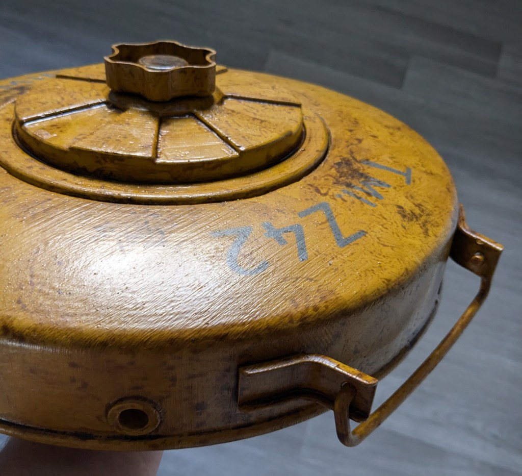 M39 smoke grenade with stencilling as shown, and comes with removeable cap and replica porcelain ball, fuze + detonator (removeable), and removeable head. Hand painted so there will be slight variations in the finish.
