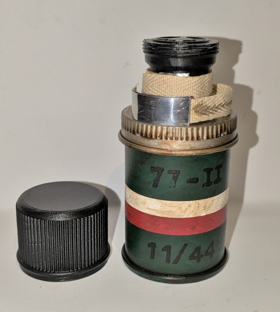 Replica No. 77 grenade with No. 247 fuze and cap. Stencils as shown and weathering/aging applied to give a more authentic look, but you can have them factory fresh if you want! The fuze cap can be removed, but not the fuze itself. The fuze comes with a repro arming tape, with lead weight and pin as shown, (aged to match the grenade). Hand painted so there will be slight variations in the finish. Mk I and Mk II available as shown.