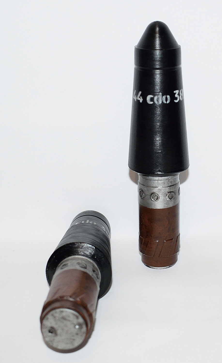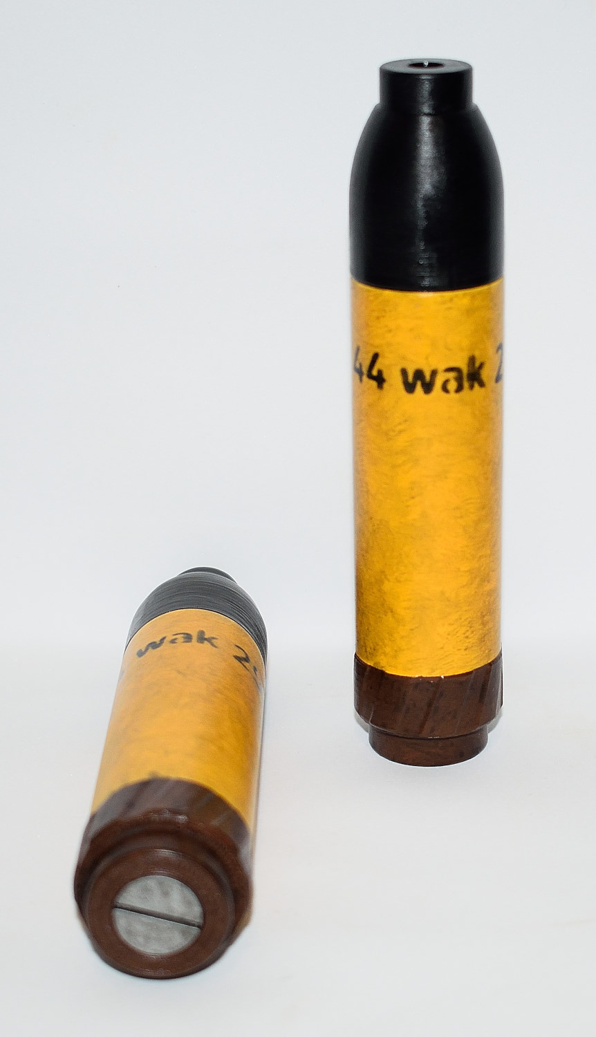 German Rifle High-Explosive Grenade, 30mm, as used with the Schiessbecher on K98 rifles. Comes with stencilling as shown and base can be coloured in either silver or Bakelite brown. Hand painted so there will be slight variations in the finish.