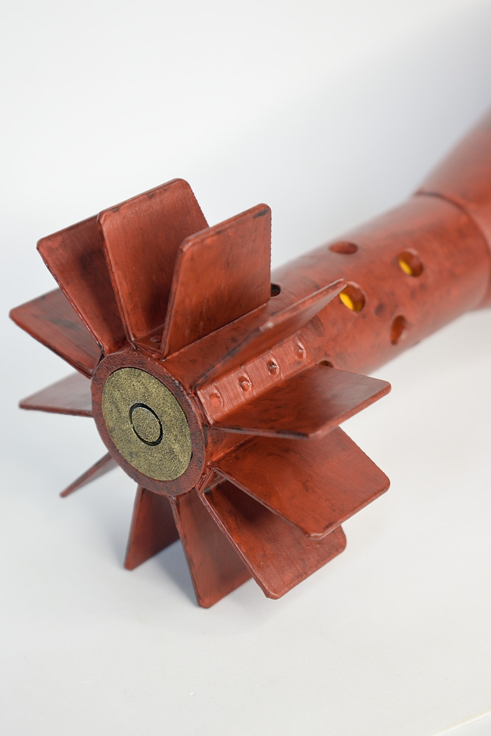 1:1 replica incendiary bomb with ’tile breaker’ and fin painted just like the original, and an aging wash to give it an authentic look. The fin itself has all the spot welding marks of the original. Hand painted so there will be slight variations in the finish.
