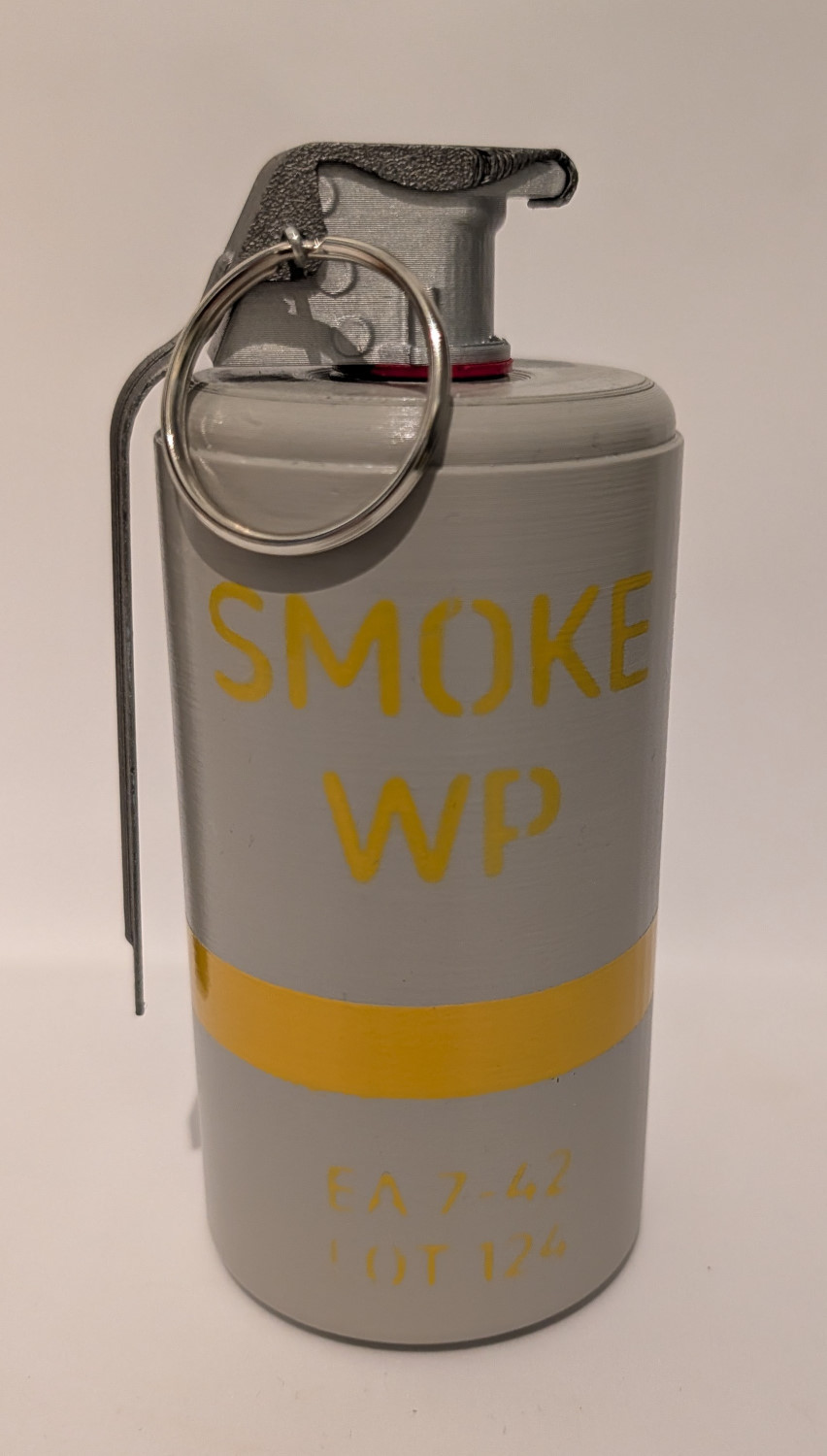American M15 white phosphorus smoke grenade, nicknamed ‘Willy Pete’. Comes with split pin and ring. Fuze and spoon completely removeable. The body is hollow so you can add sand or other material to it to give it some weight! Hand painted so there will be slight variations in the finish.